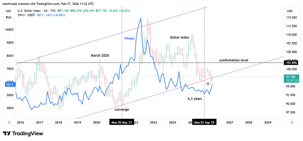 4,3 tahun kemudian dari Mei 2021 adalah September 2025. Di saat itu, 2 hal terjadi: Wheat membentuk bottom dan Dollar kembali berada di lower channel. Sejak itu, kedua market tersebut membentuk double bottom di Januari 2026 (di bulan yang sama ketika Gold dan Silver mengalami penurunan drastis).